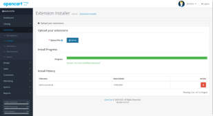 To uninstall an extension in OpenCart, go back to the Installer, find the extension in the Install History and click the red Uninstall button.