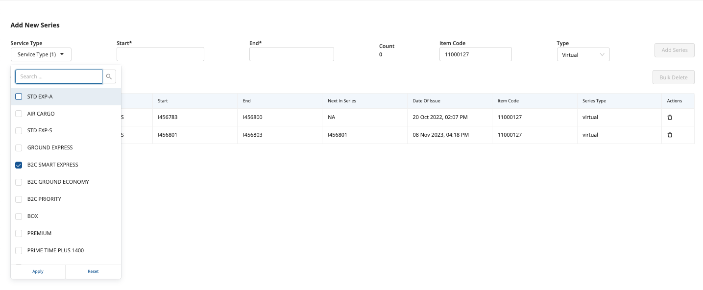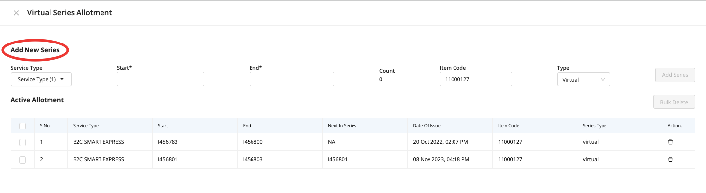 Search the desired Customer → click on Virtual series icon on the right side menu, this redirects the user to the Virtual Series Allotment screen:
