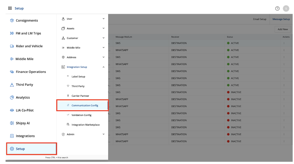 Navigating to Communication Config Setup