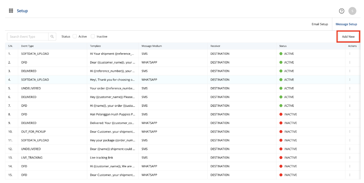 - Users are then redirected to the templates list view page. This page has two sub tabs - message setup and email setup. The default landing page is message setup