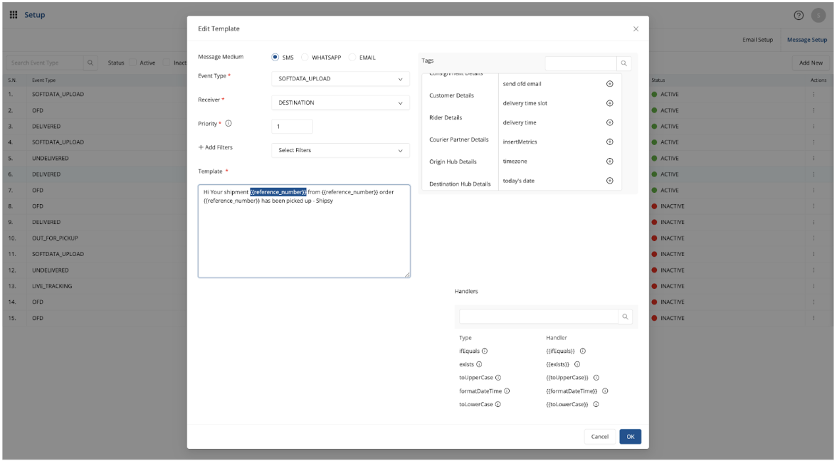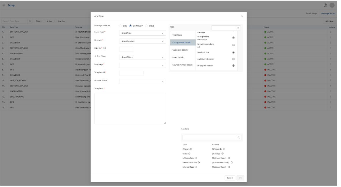 While configuring a message template, users can use tags and handlers to automate how information is fed into the dynamic template such that each message is customised as per their requirements