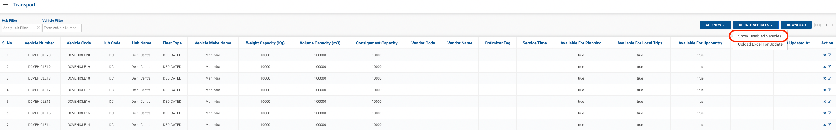- Click on Update Vehicle DropDown → Show Disabled Vehicle