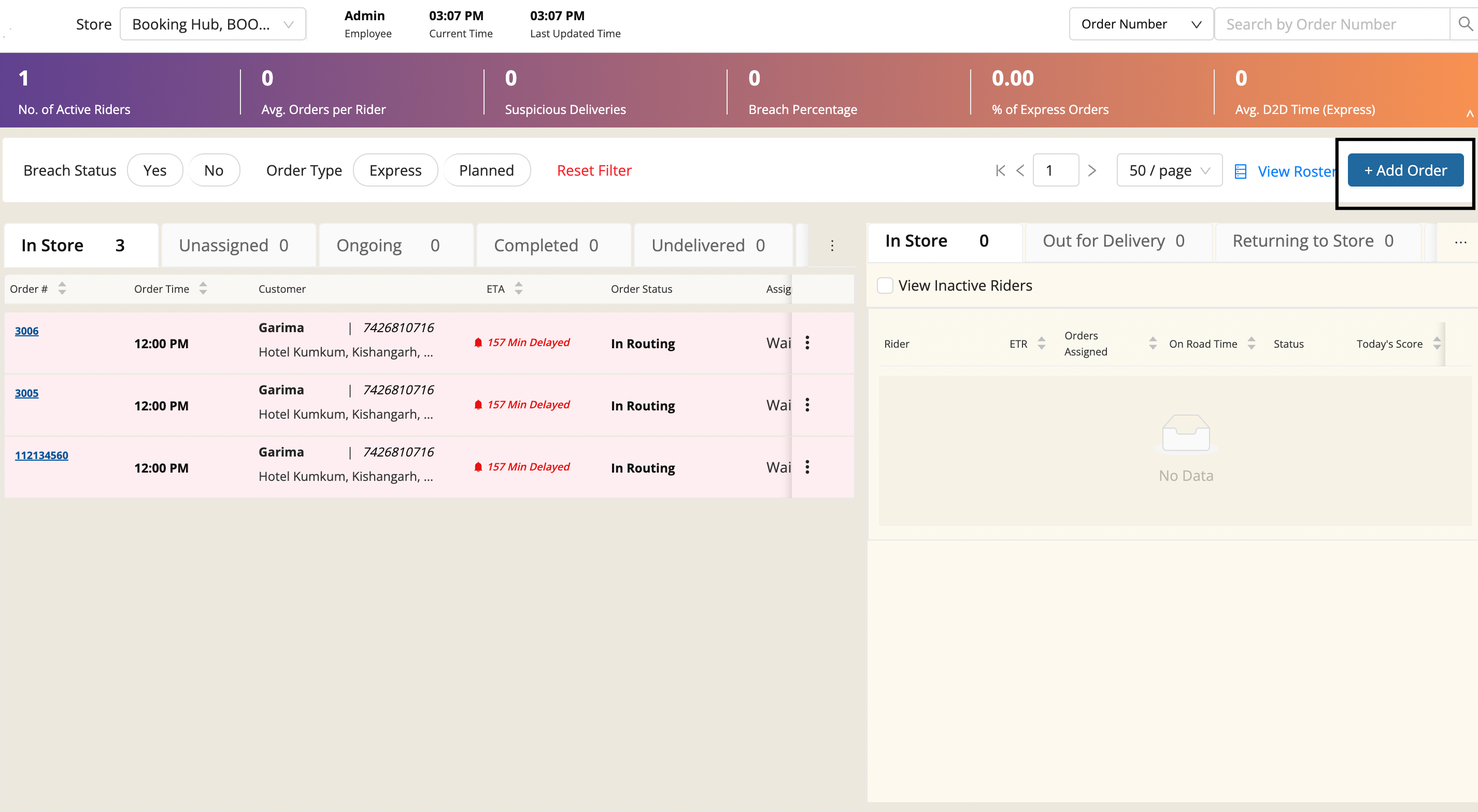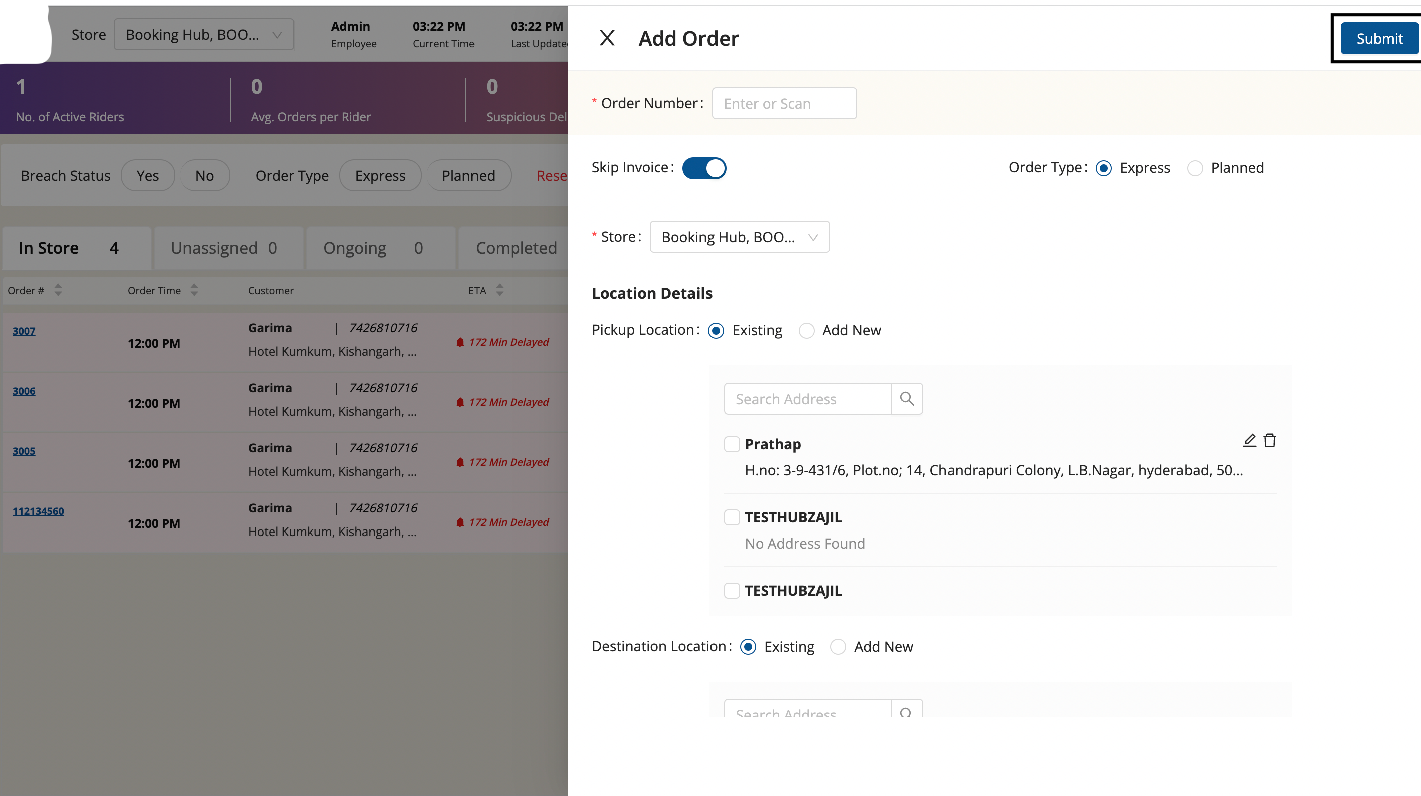 - Type down 'Order Number' → Toggle for Skip Invoice & Choose for Order type (Express or Planned) → Store has to be chosen for the hub you want the order to be ordered