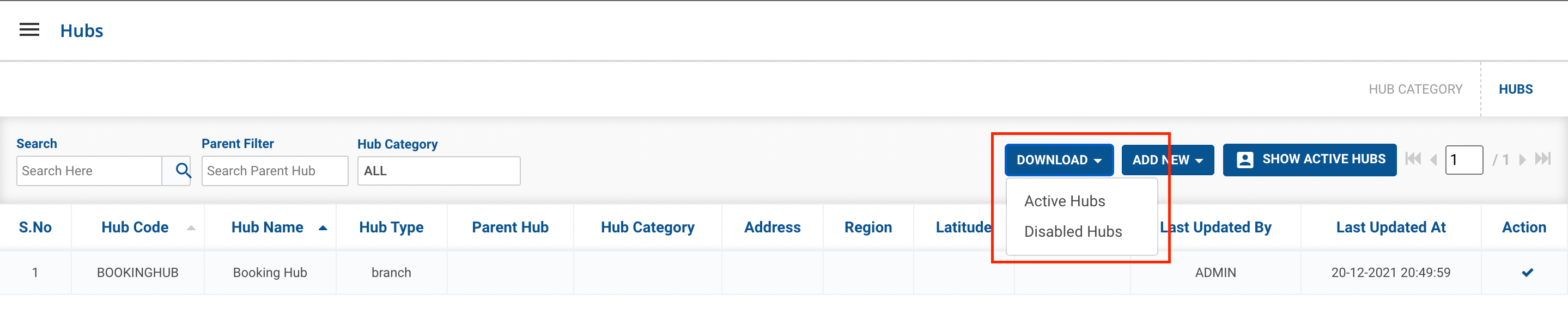 - Select between Active Hubs and Disabled Hub. (If you want active hub data, click on Active Hubs else if you want deactivated hub data, click on Deactivated Hub).