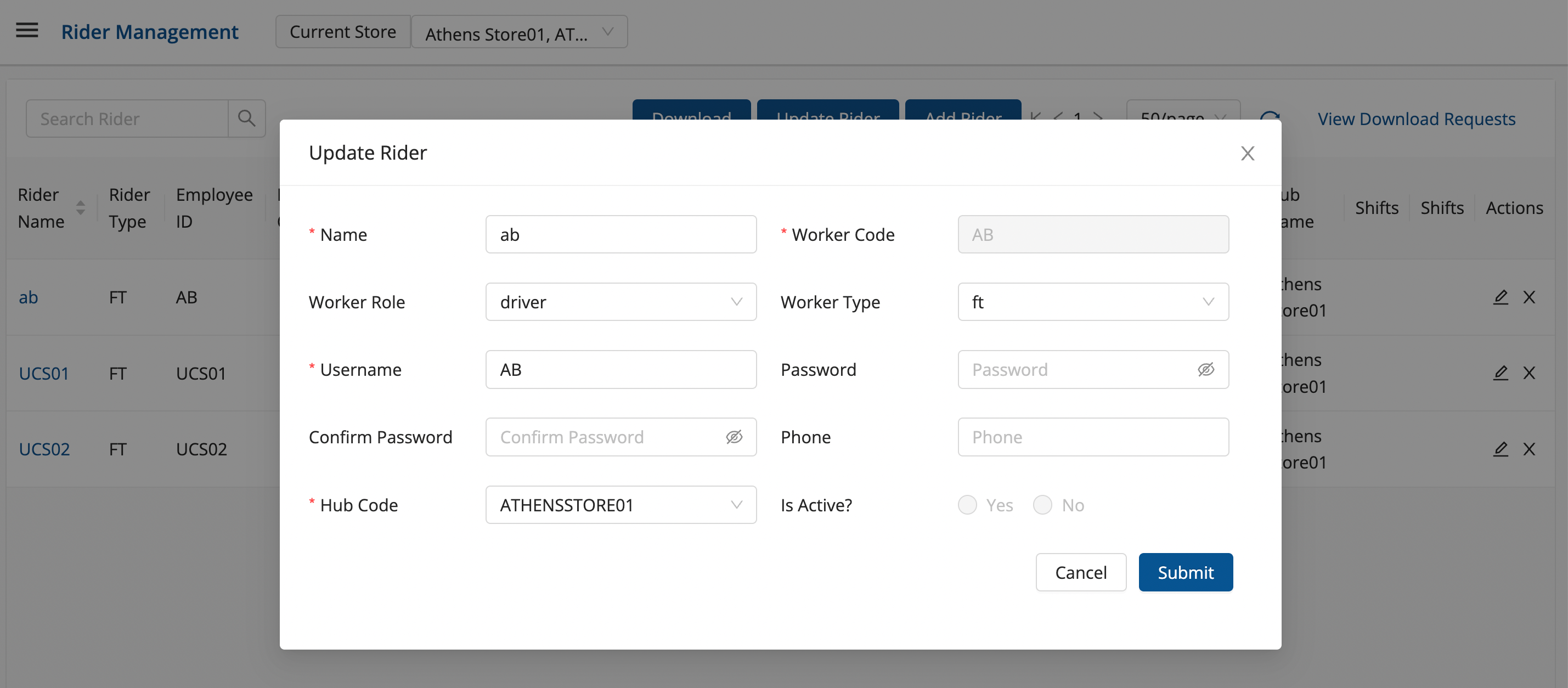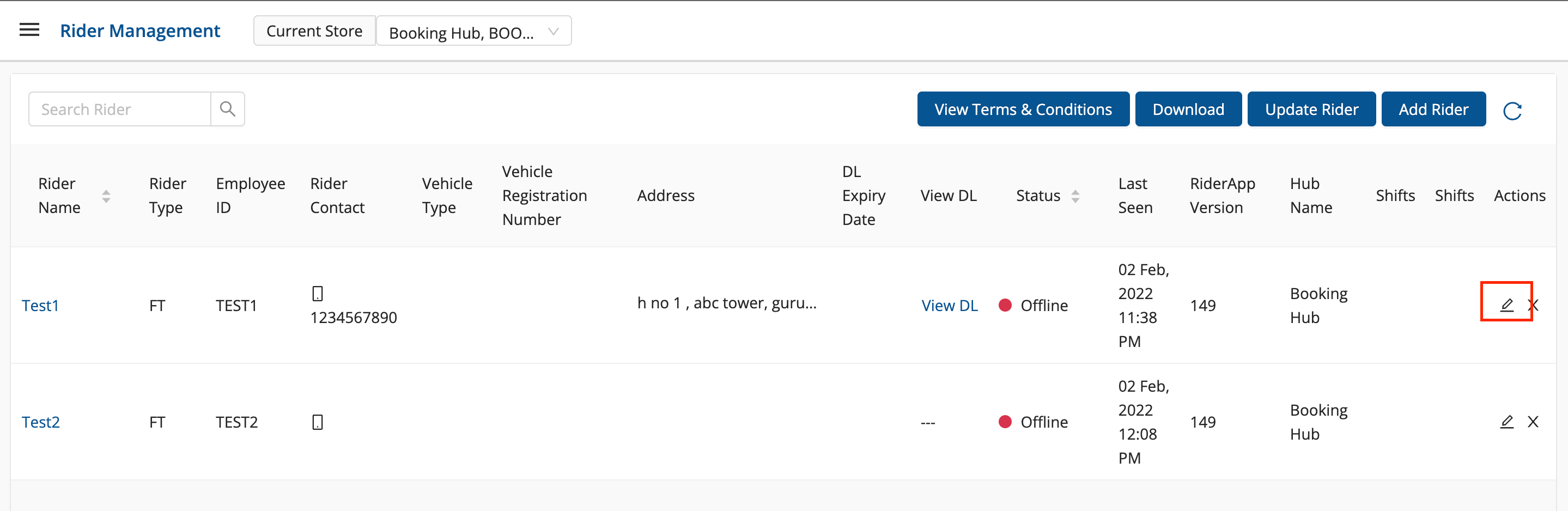 Click on Edit Rider button() under Action column → A form shall appear with existing data. This method is used to update single rider data.