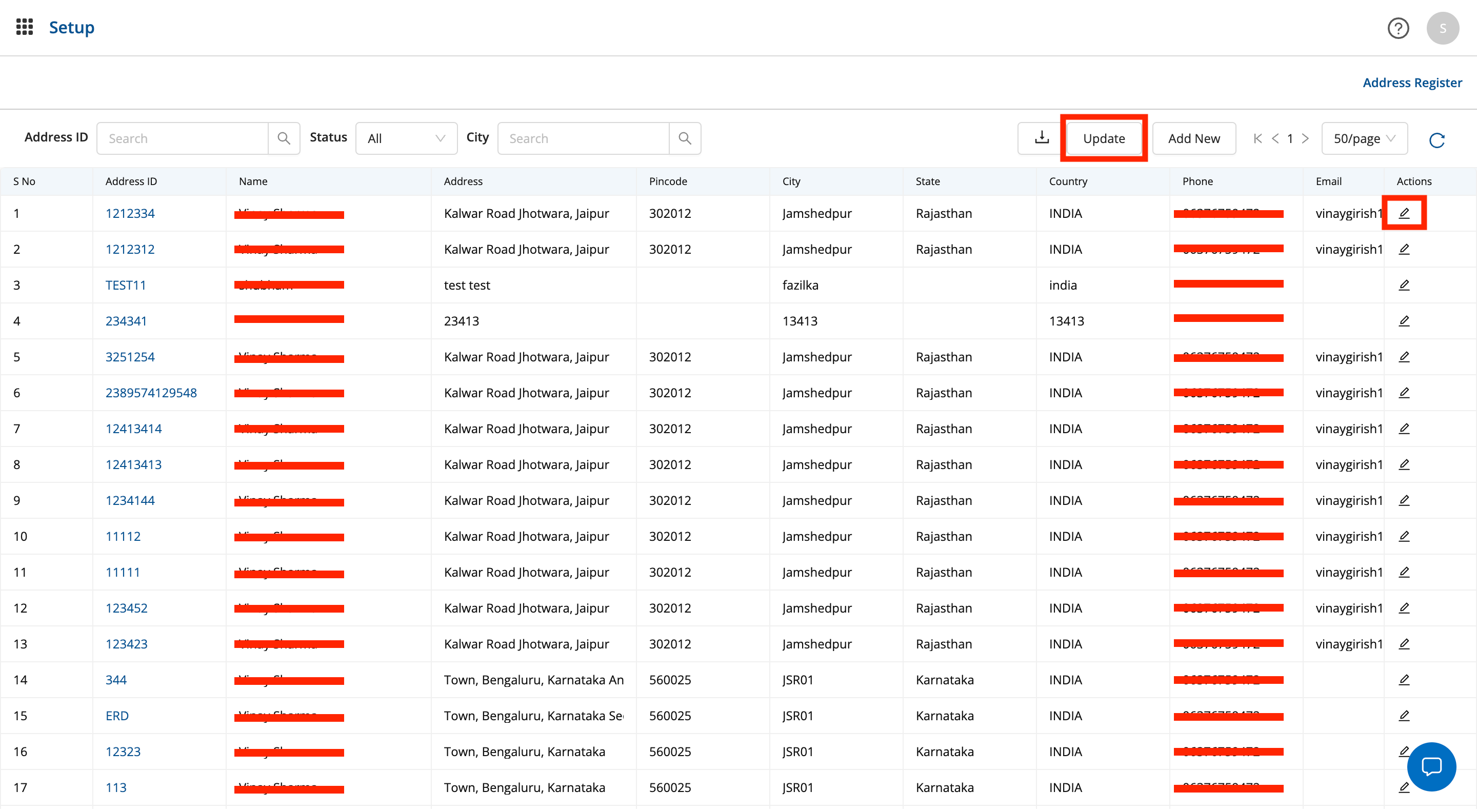 - To edit/update address, click on the update button (for bulk upload) or the edit icon to edit single address