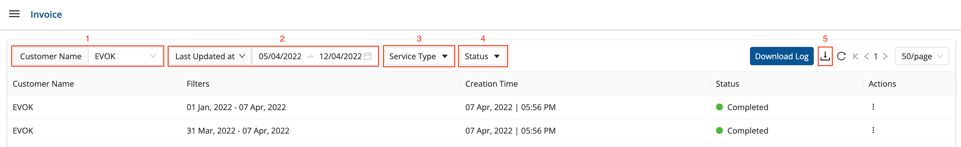 Customer Name(1),Date Filter/Range(2),Service Type(3), and theStatus of Consignment(4)for which the Invoice is to be generated.