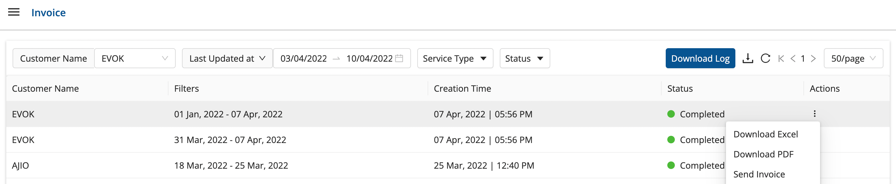 ActionsColumn after theStatuschanges from Pending → Completed, and select from the followingoptions:- Download Excel - To download the invoice in form of an Excel sheet with details of all consignments.