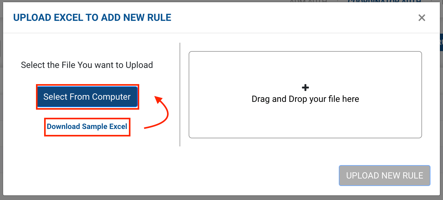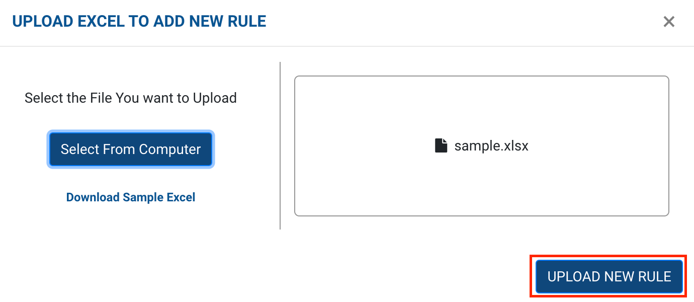 Method 2 - Upload Excel to Add New Rule option → A form appears with the required fields to be filled.
