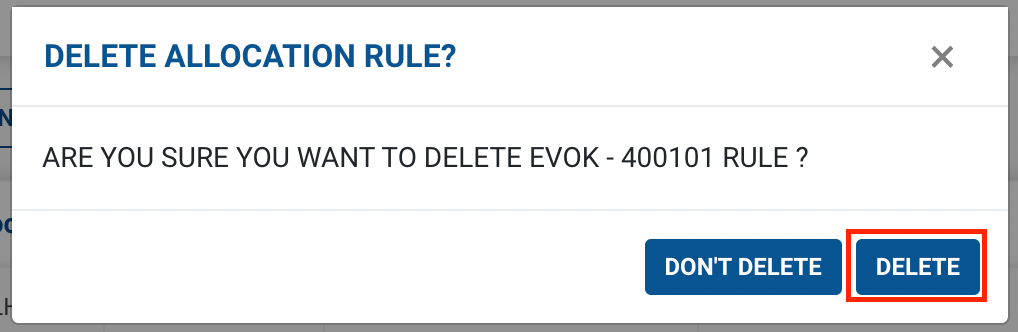 Then confirm deleting the rule by clicking on the Deletebutton and the Don’t Delete button if you don’t want to delete the Allocation Rule.