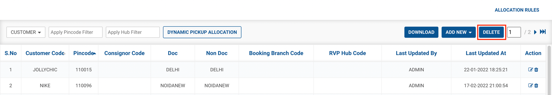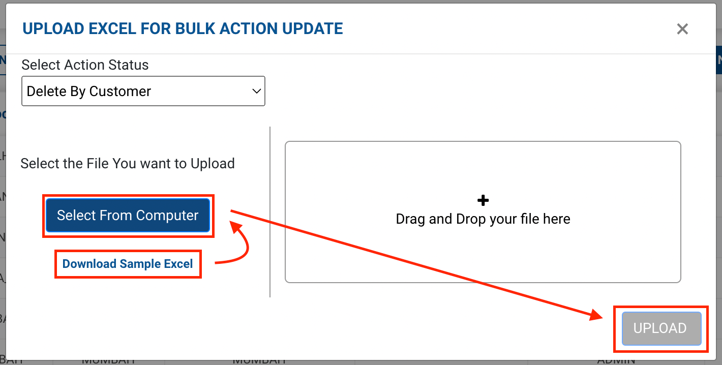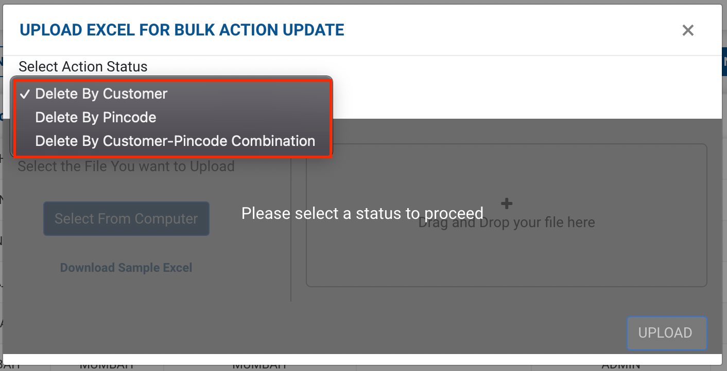 - Select the Action Status (Delete by Customer/ Delete by Pincode/ Delete by Customer-Pincode Combination) using which Bulk Delete Action will occur.