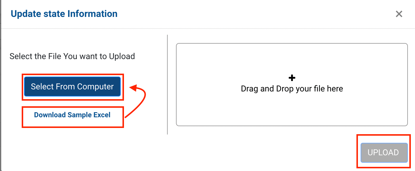 Method 2- Upload Excel for Update option → A file upload window appears.
