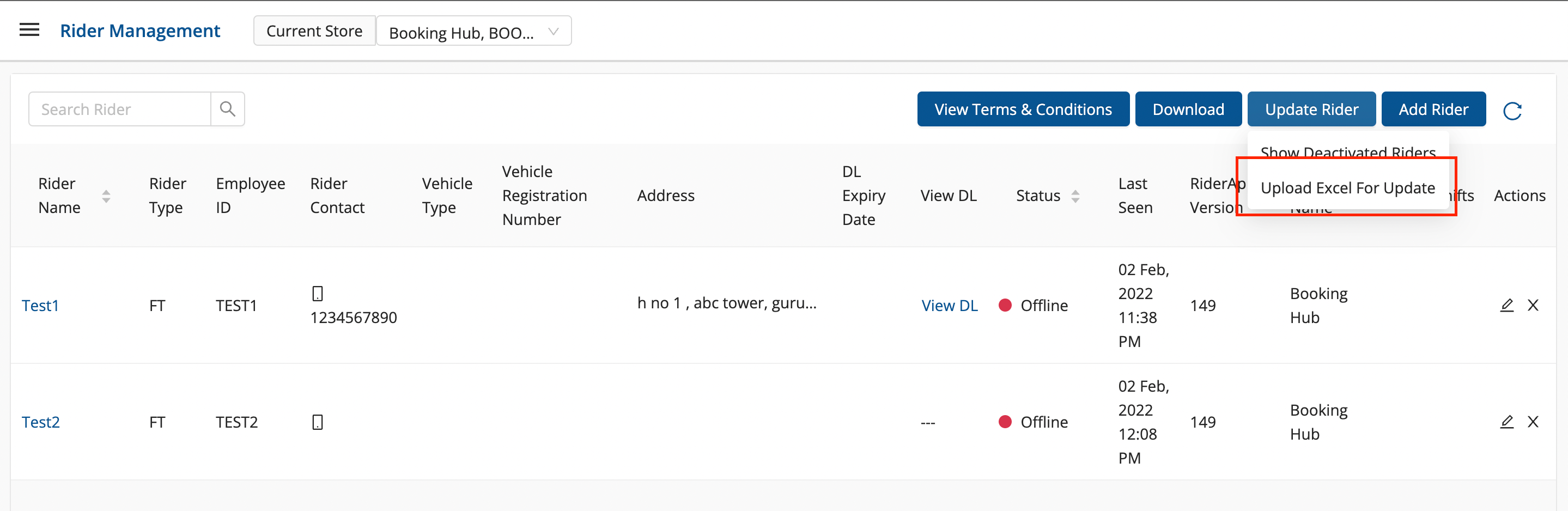 - Click on Update Rider → Upload Excel For Update. This method is used to update rider data in bulk.