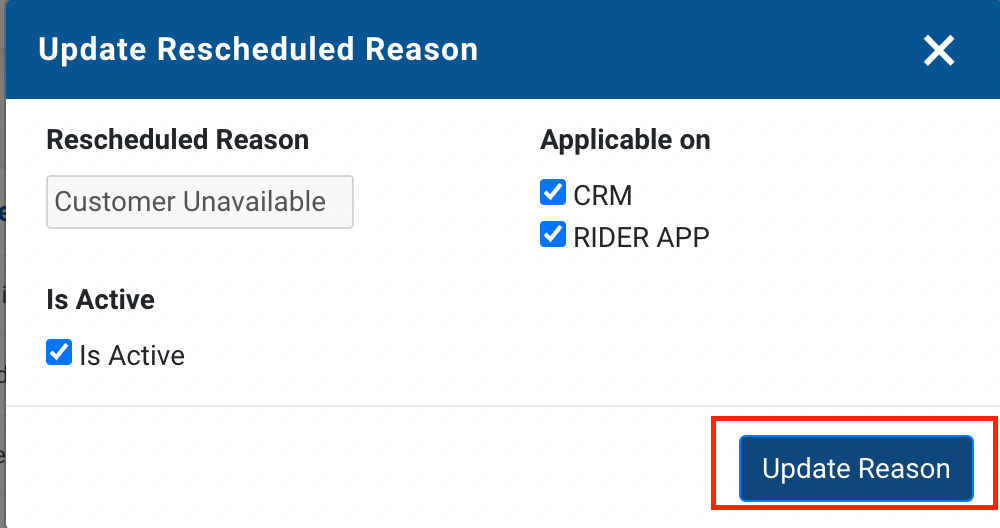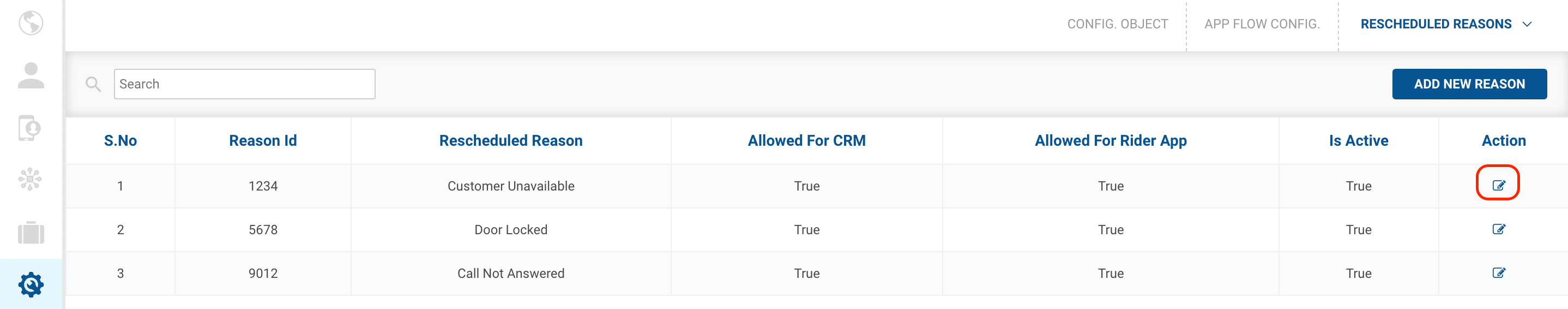- Click on the Edit Rescheduled Reason () icon on the right side of the table under the options column.