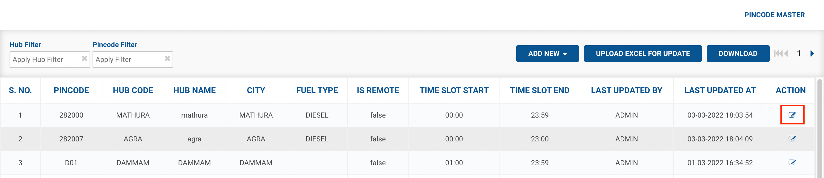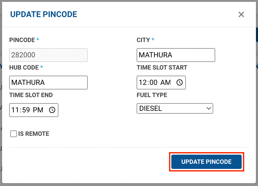 Method 1- Click on Edit Pincode button() under ACTION column → A form shall appear with existing data. This method is used to update a single pincode allocation rule.