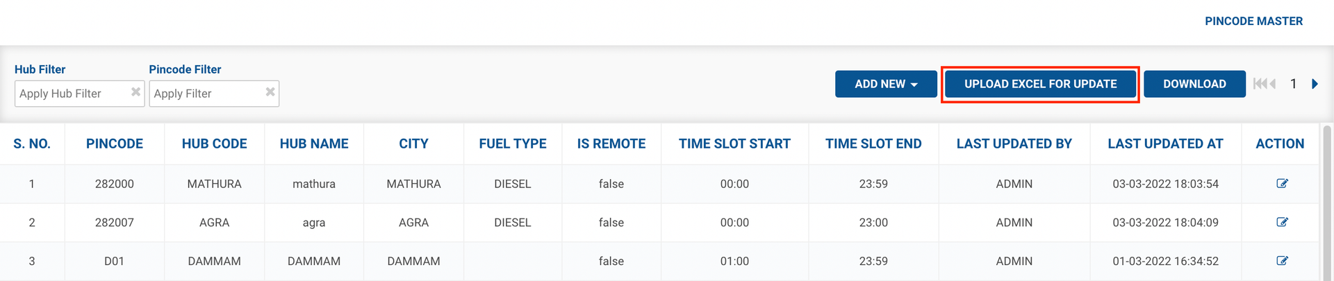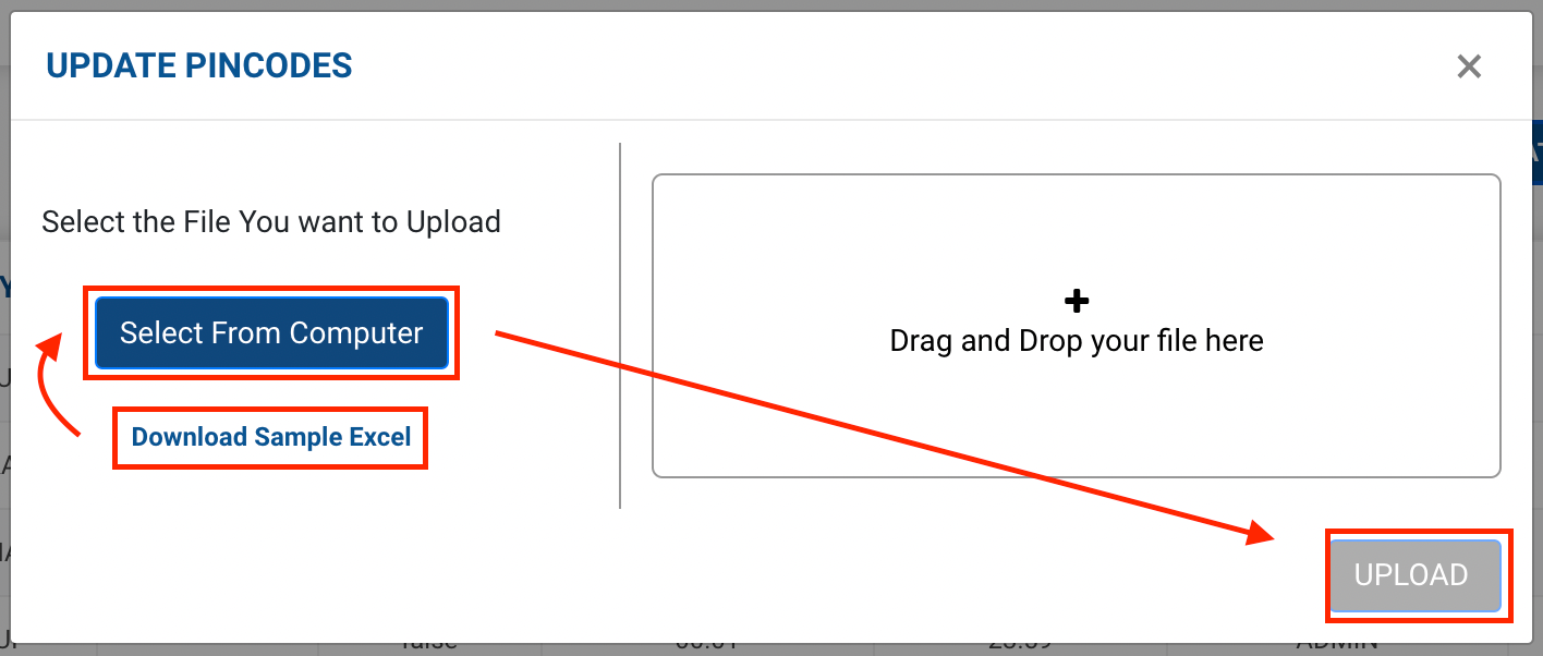 Method 2- Click on UPLOAD EXCEL FOR UPDATE button. This method is used to update multiple pincode allocation rules.