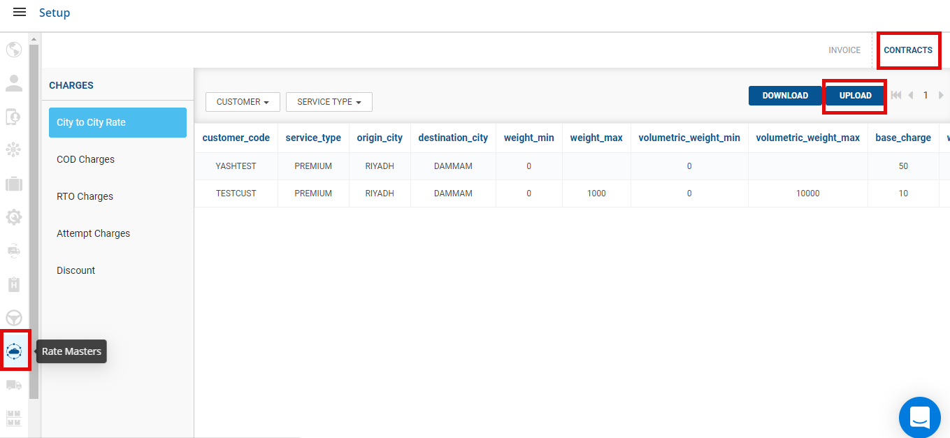 - In the dashboard → Click on the Hamburger Menu () → Setup → Rate Masters () → Contracts
