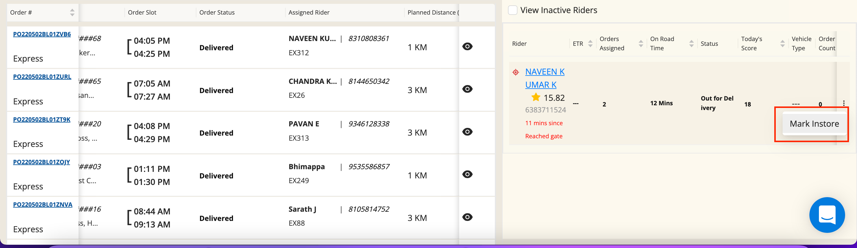 Click on Three Dots of rider and click Mark Instore Button.