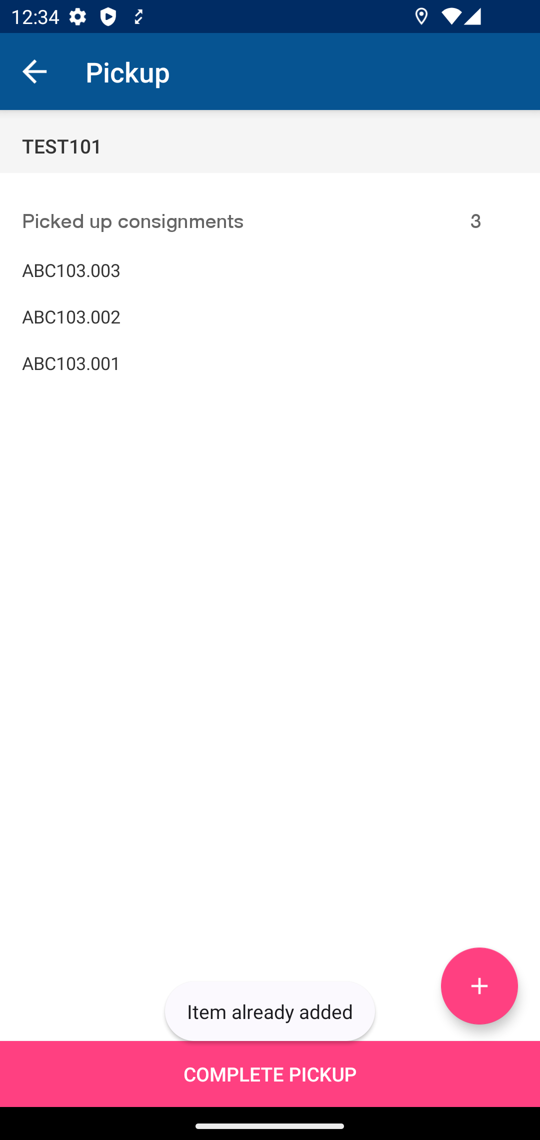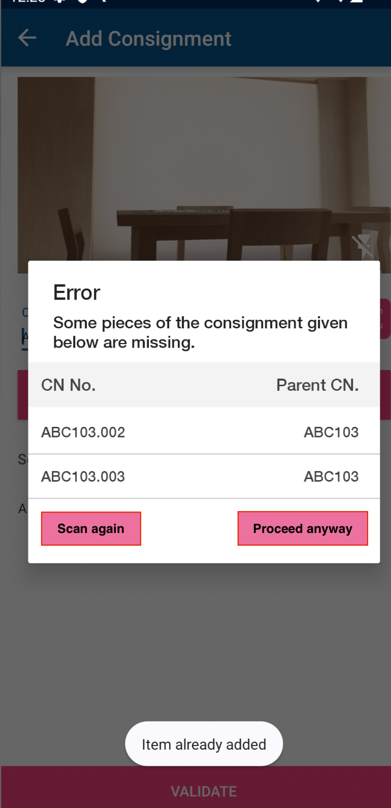 Click on ‘scan again’, if you want to scan the remaining CNs. Click on ‘proceed anyway' if you want to complete pick-up partially. You will be redirected to the following screen.