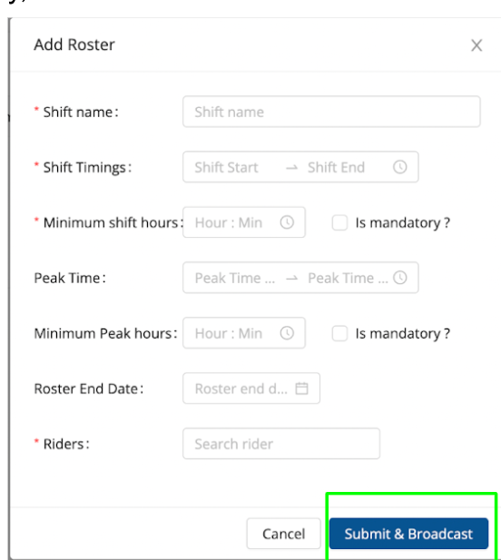 | Is Mandatory ? | Mandatory for Rider to be present between the minimum Shift Hours. | CheckBox |