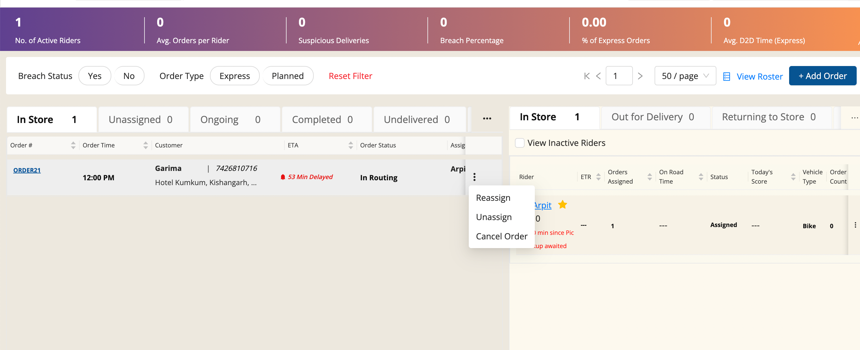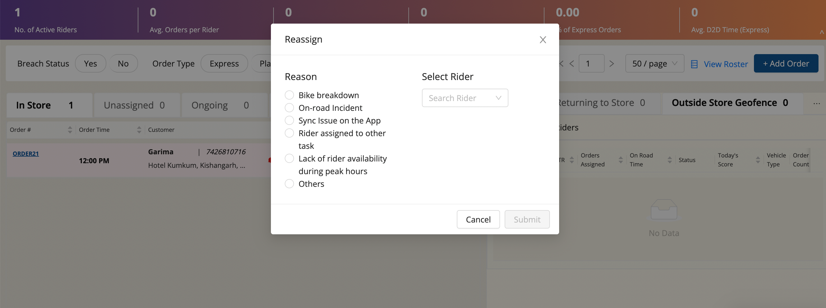 Article 8mfCG6dU · sourceDescription: We can reassign the order to the order rider in the dispatch screen.