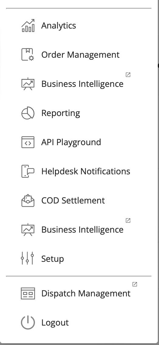 | Main Menu | The main menu will have the list of menu items that are more frequently used on a day to day basis, the list of sections will be as mentioned in the description. | List of menu items: * Analytics * Order Management * Business Intelligence * Reporting * API Playground * Helpdesk Notifications * COD Settlement * Business Intelligence * Setup * Dispatch Management * Logout |