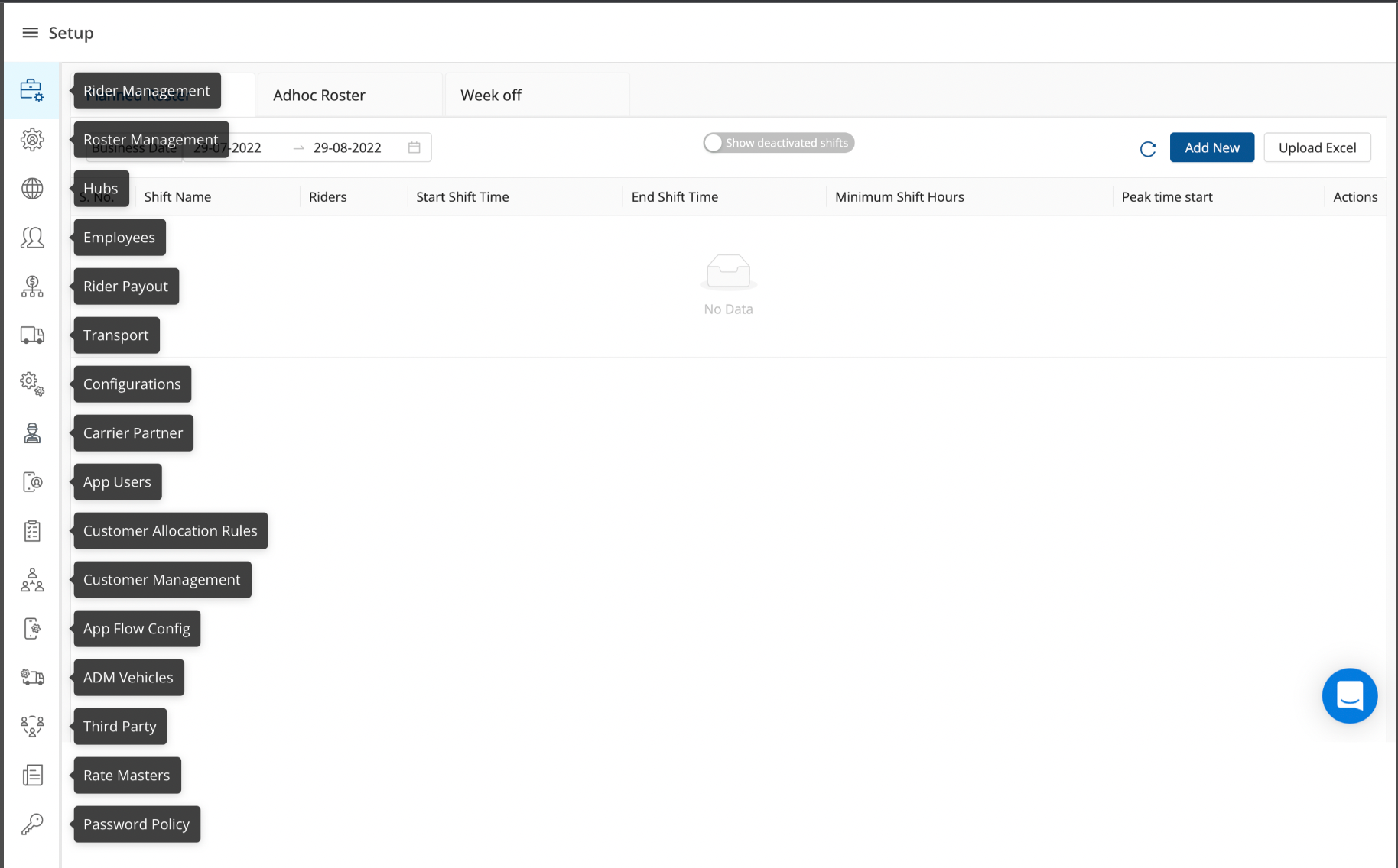 | Setup Menu | The setup functionalities will be all clubbed together for quicker access and concentrated effort while setting up the hubs, riders, etc. | This menu can be accessed by clicking on the Setup button on Main Menu. List of menu items that will be present in the Setup section: * Hubs * Employees * Carrier Partner * Transport * Configurations * Roster Management * Rider Management * Rider Payout |