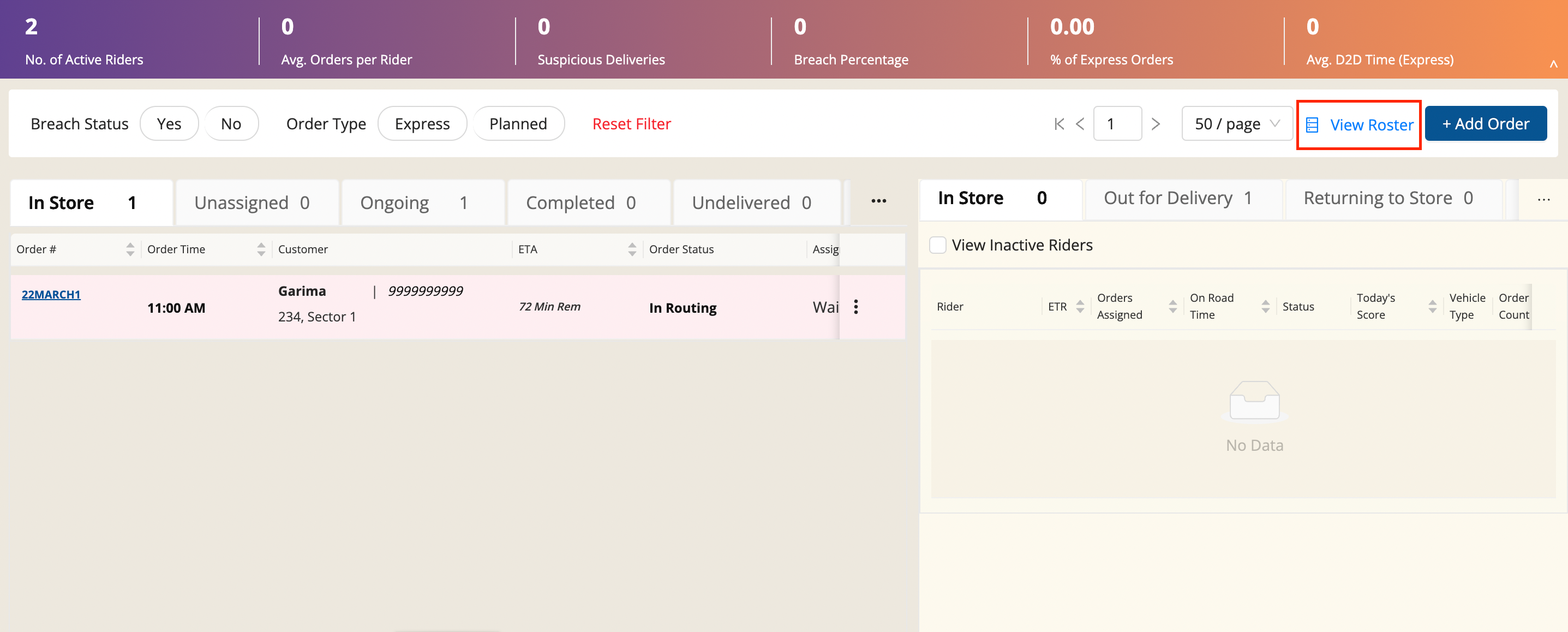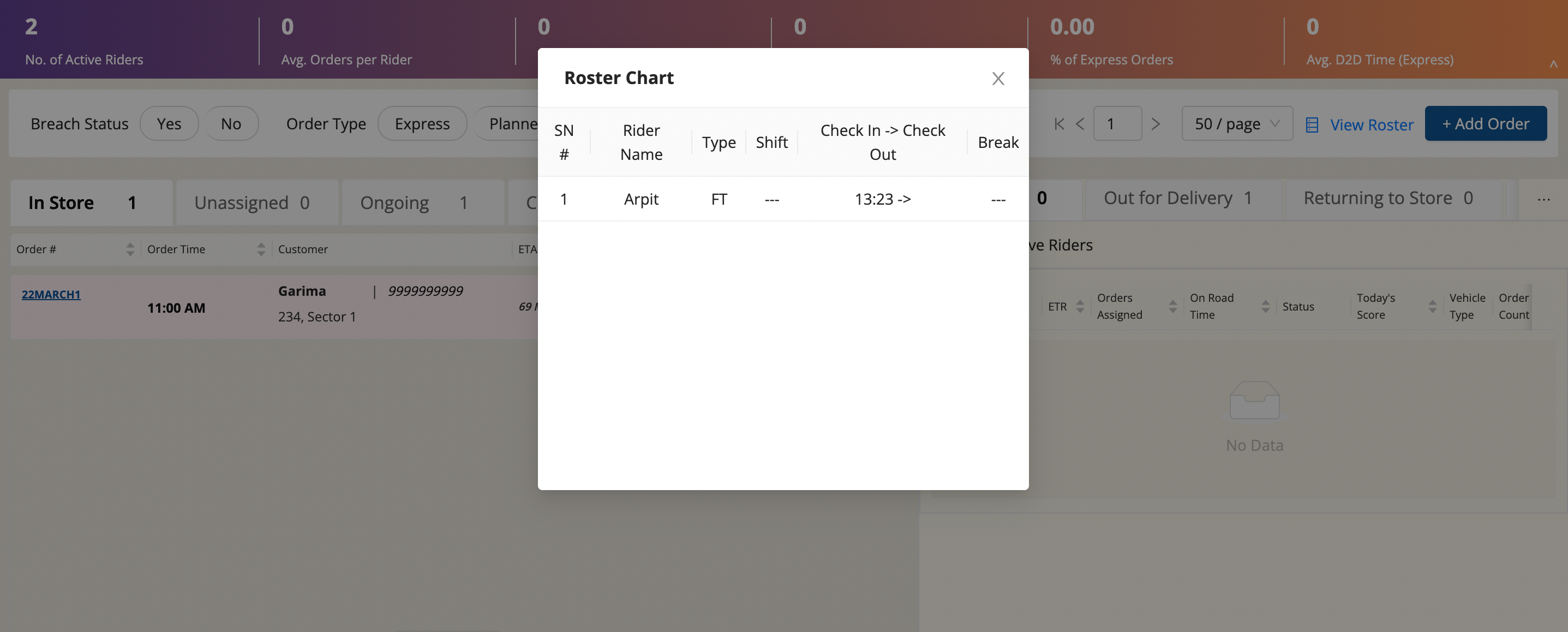 Description: Hub Manager can see the details of rider in the dispatch screen related to check in check out and break timing.