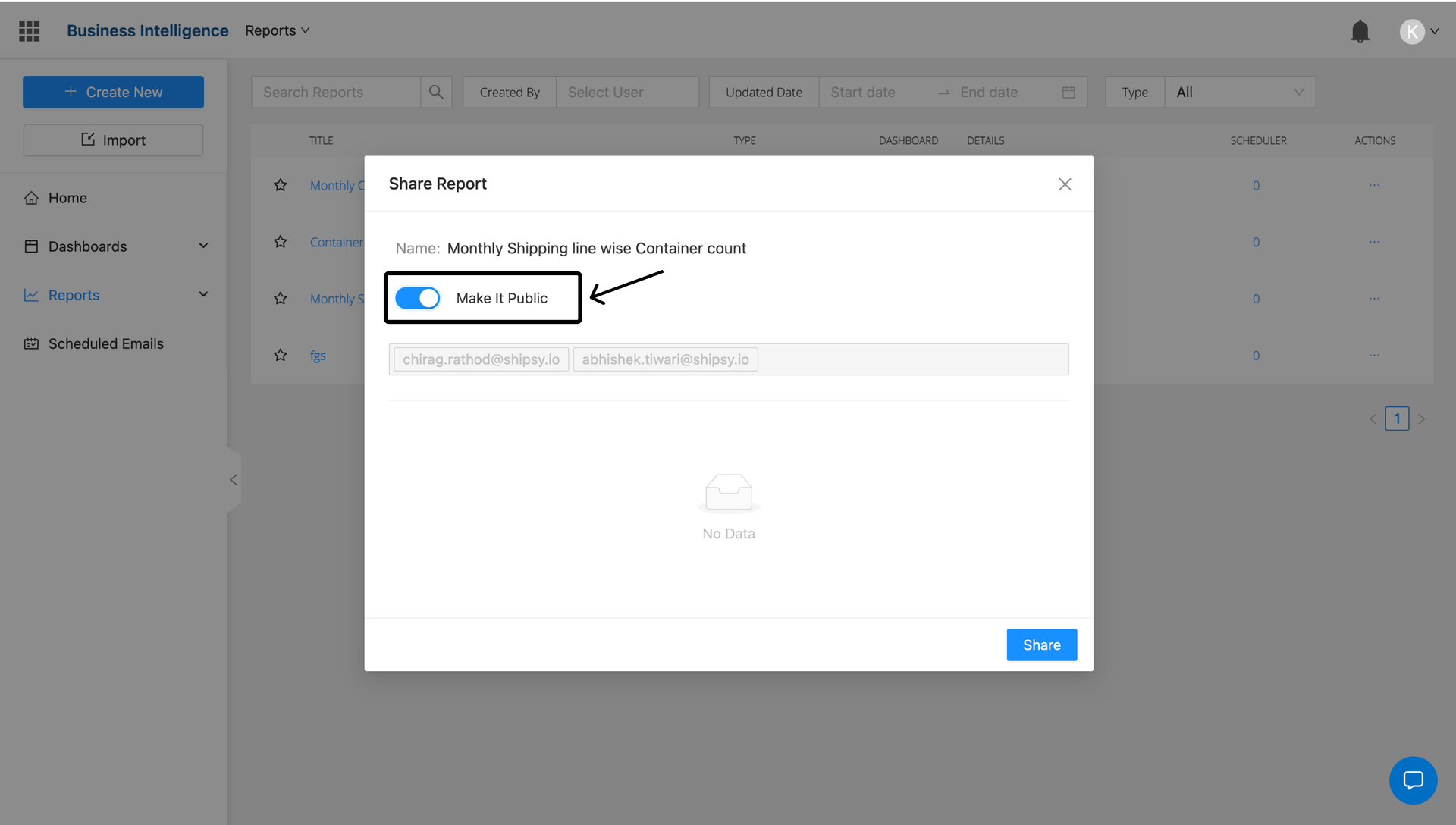 Reports can be either shared with only particular members of the org or can be made public. Once you choose the desired option, click on the share button.