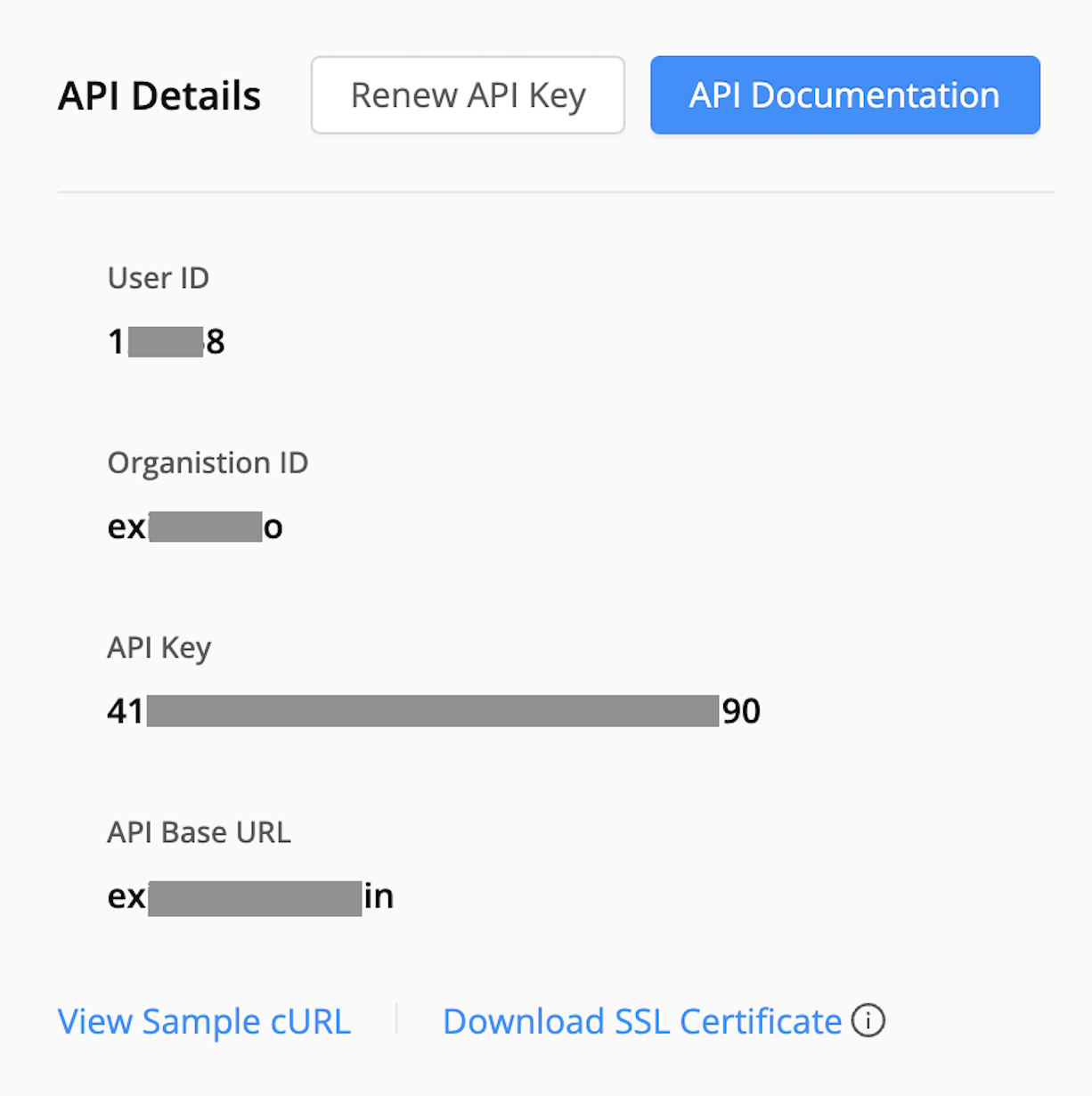 After clicking the above CTA button, admin users can access the API header details, sample API cURL and SSL certificate of the API domain.
