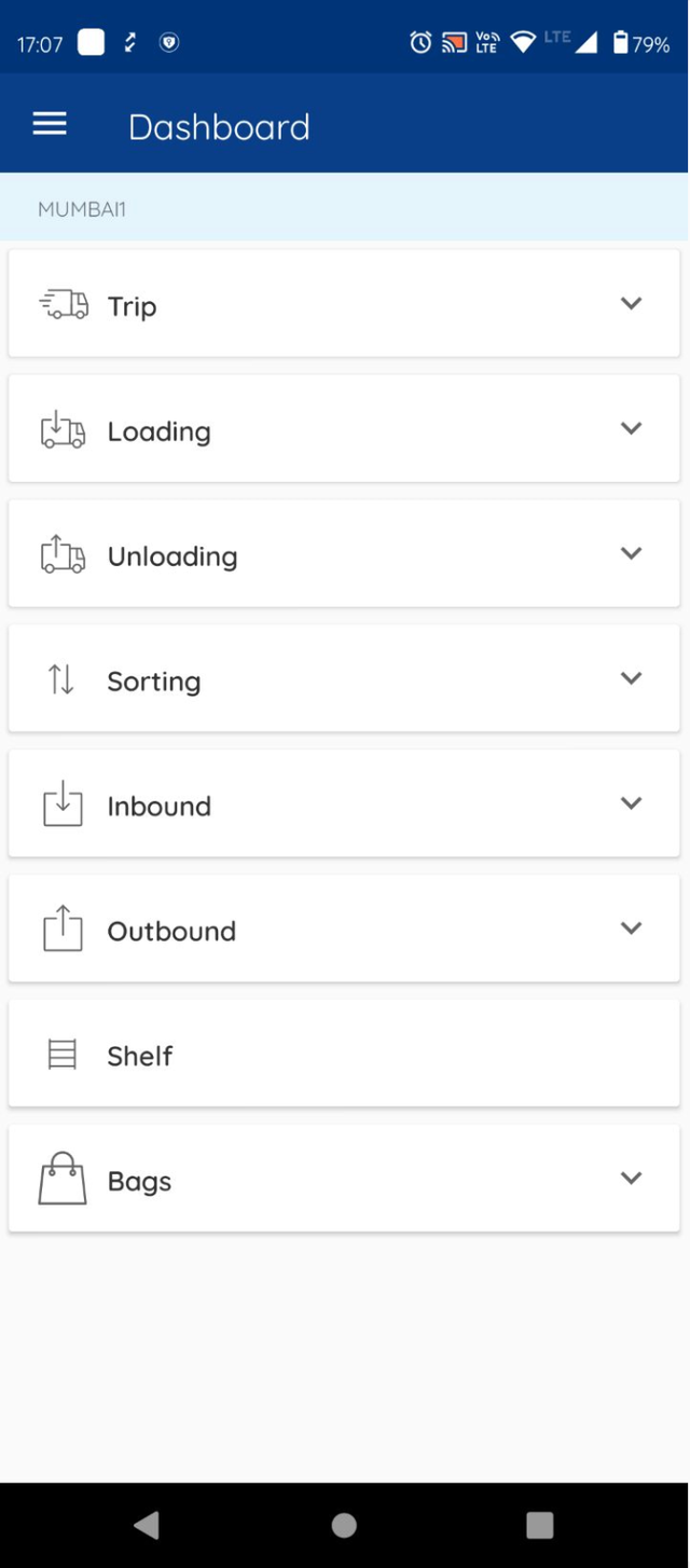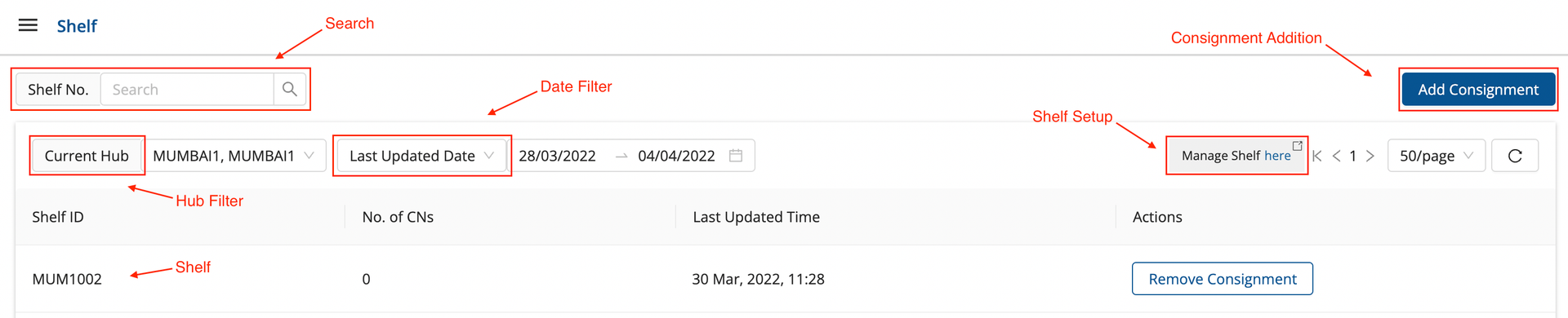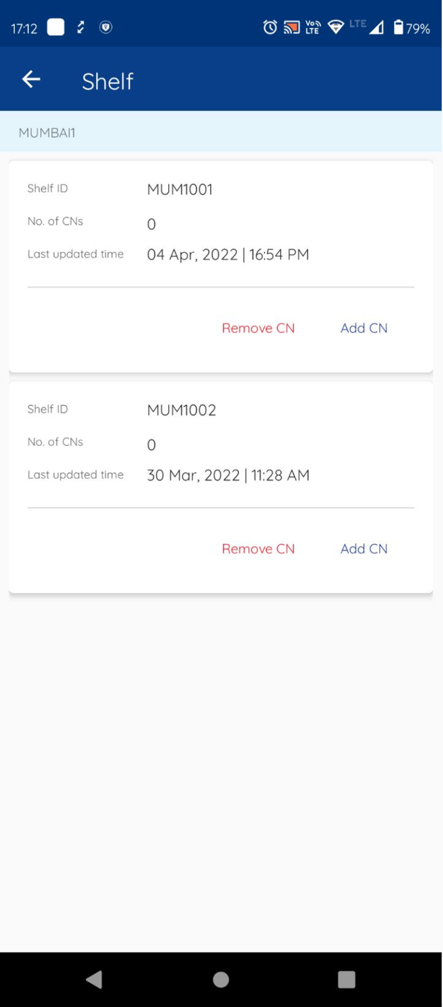 - The user can view the shelves on the dashboard, with the count of consignments present in them and the last updation time.