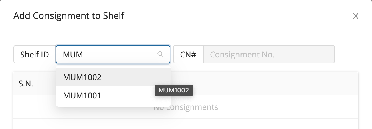 Consignment AdditionButton available in the top right corner of the screen. - A window pops up. Search for the shelf you want to add consignment to in the search bar. When selected, the option to add consignment enables.