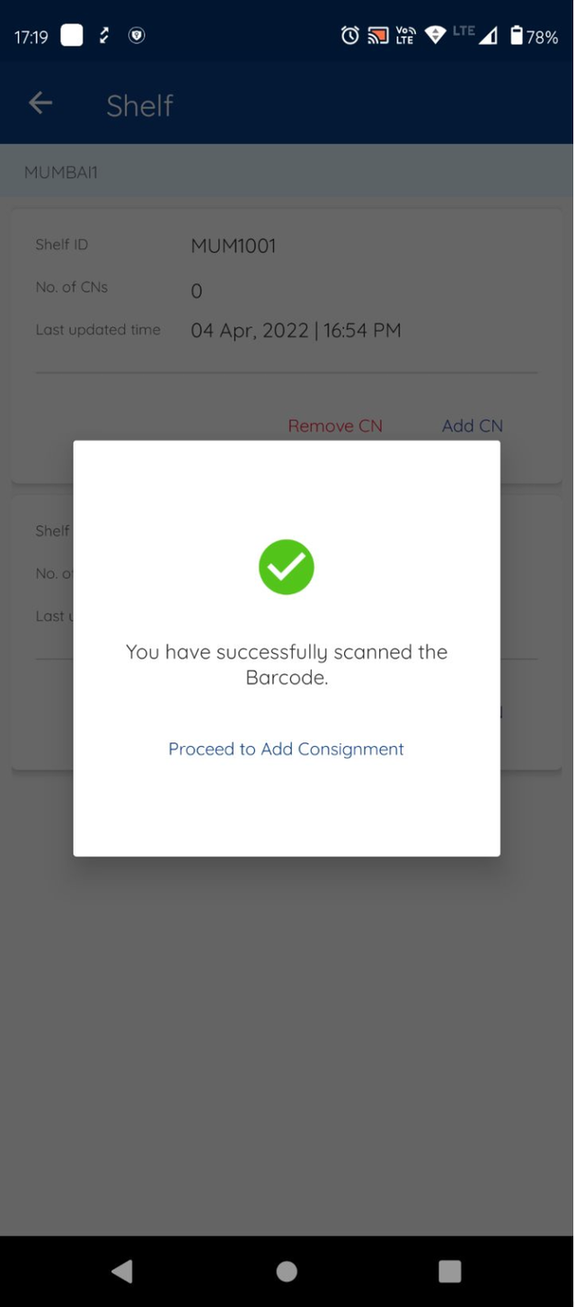 4. Click on Add CN Button, a scanning screen shows up. Scan the shelf ID.