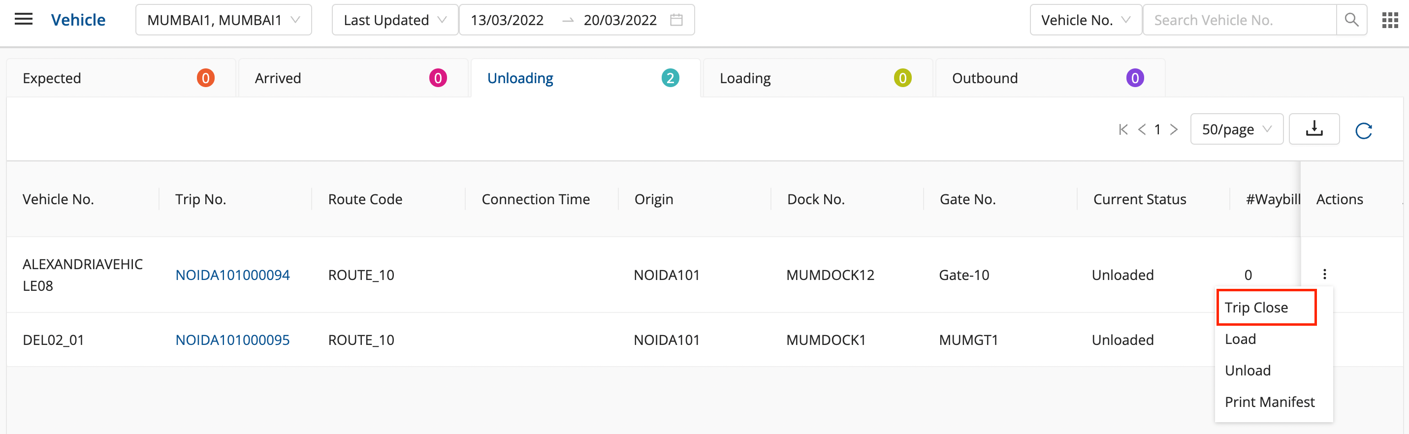 - In the Unloading section, for the required vehicle, click on the three vertical dots in the action column.