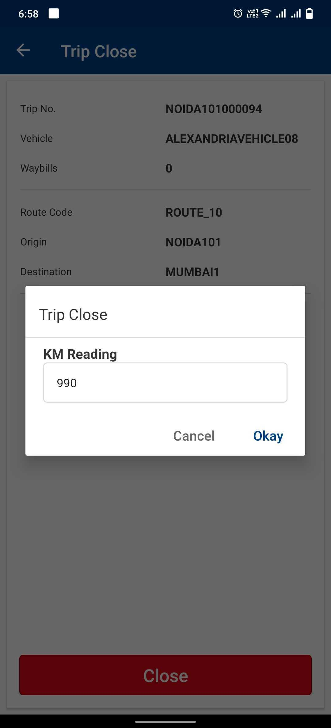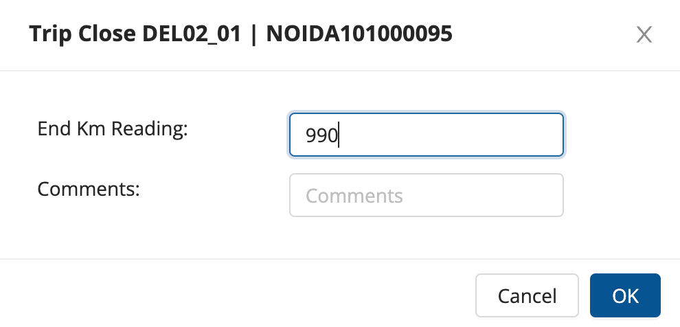 Enter the KM Reading and click on ok to close the trip successfully.