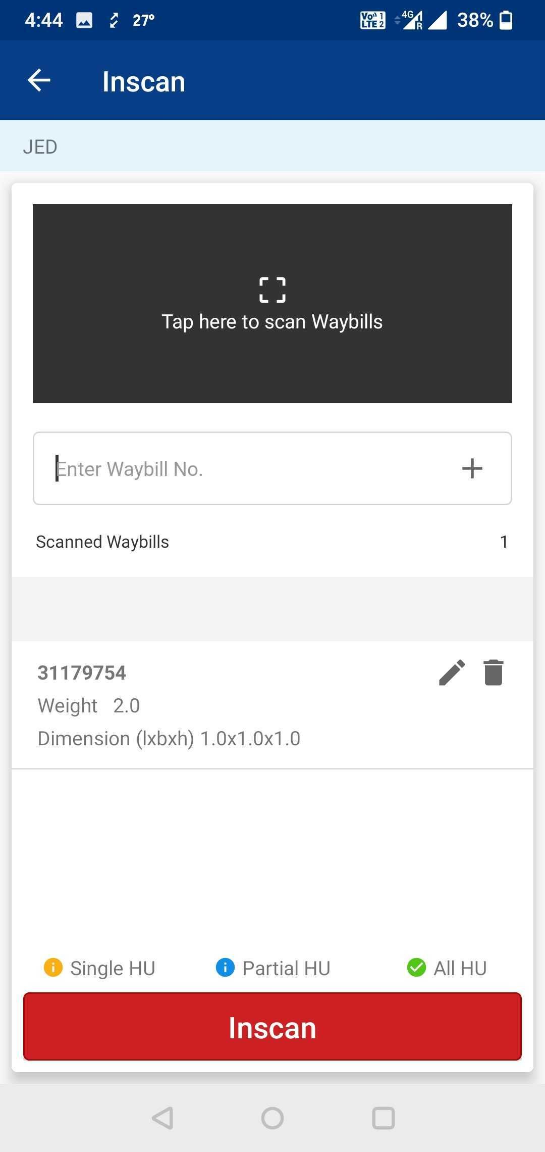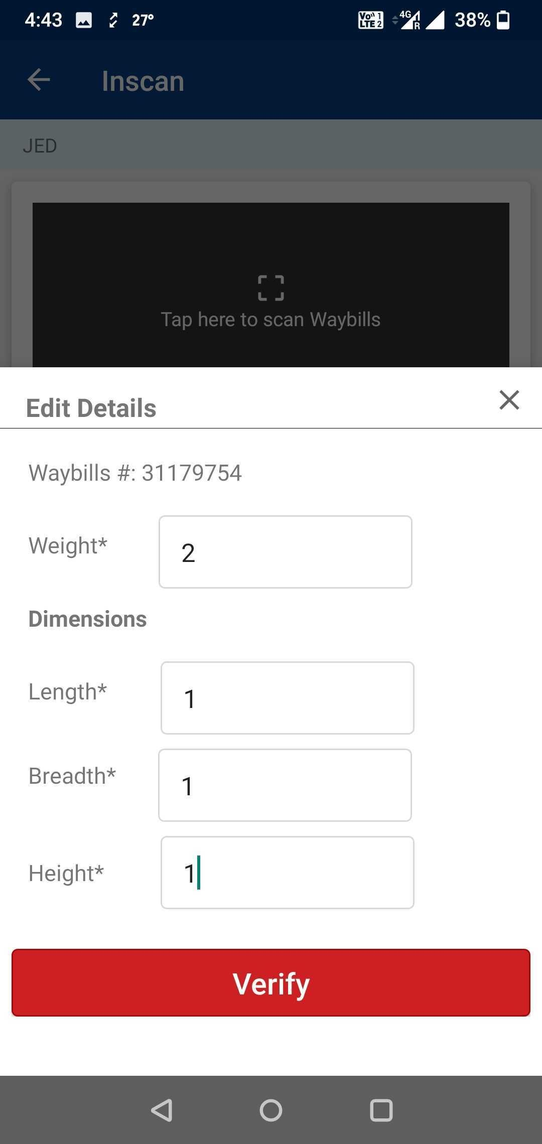During the inscan process, when we scan the waybill, we can view the consignment weight and dimensions. The user can click on the pencil icon to edit the weight and dimensions and can click on “Verify” to perform the consignment verification process.