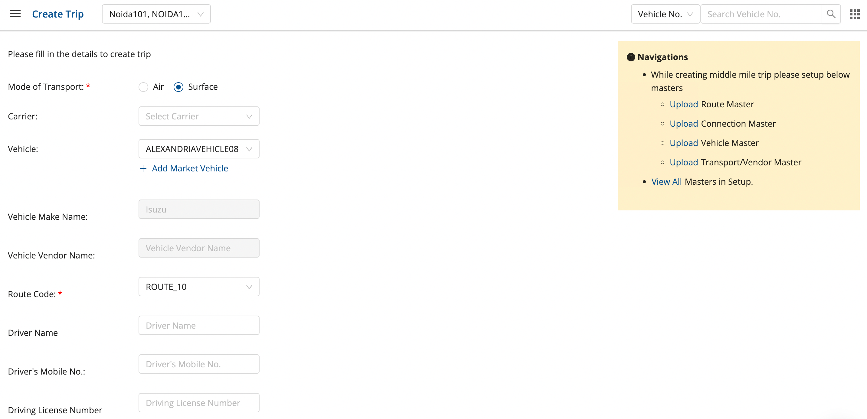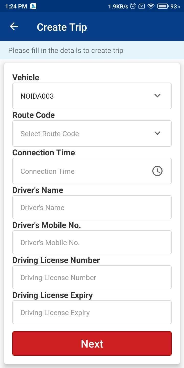- Select the required Vehicle, Route Code, Connection Time, Driver’s Name, Driver’s Mobile No., Driver’s License Number and Driving License Expiry.