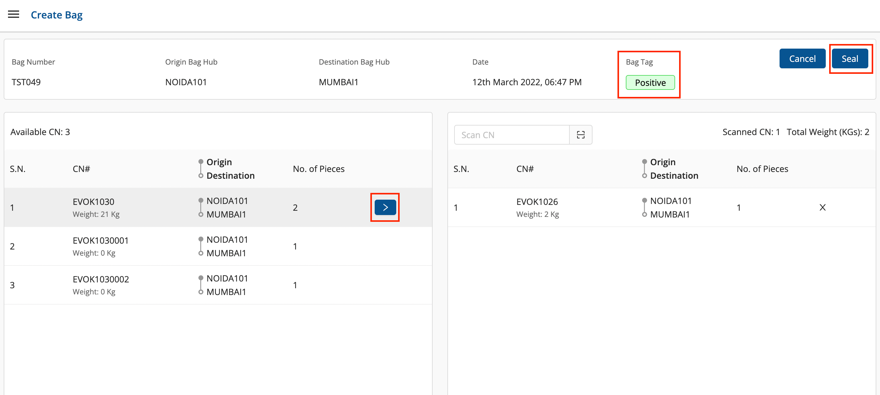 Add the required consignments to the bag and click on Seal.