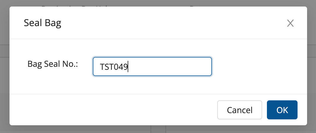 - Enter the Bag Seal Number and click on OK.