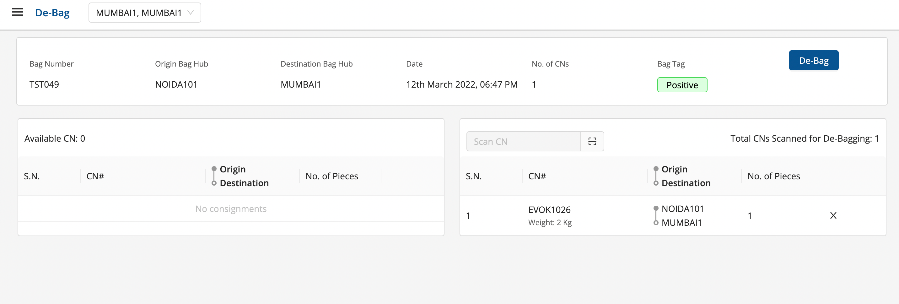 Debag is the next step after trip has been received at the destination hub, the step for de-bagging are below: