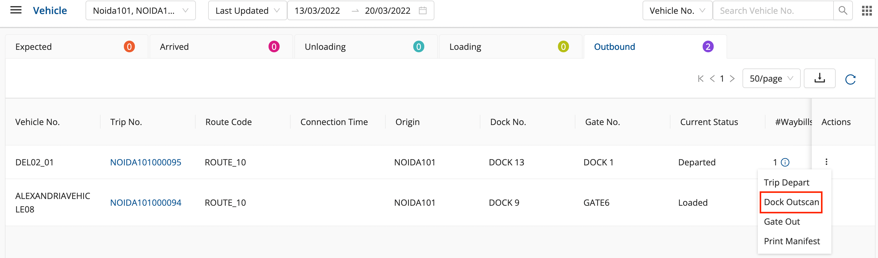 - In the Outbound section, for the required vehicle, click on the three vertical dots in the action column.