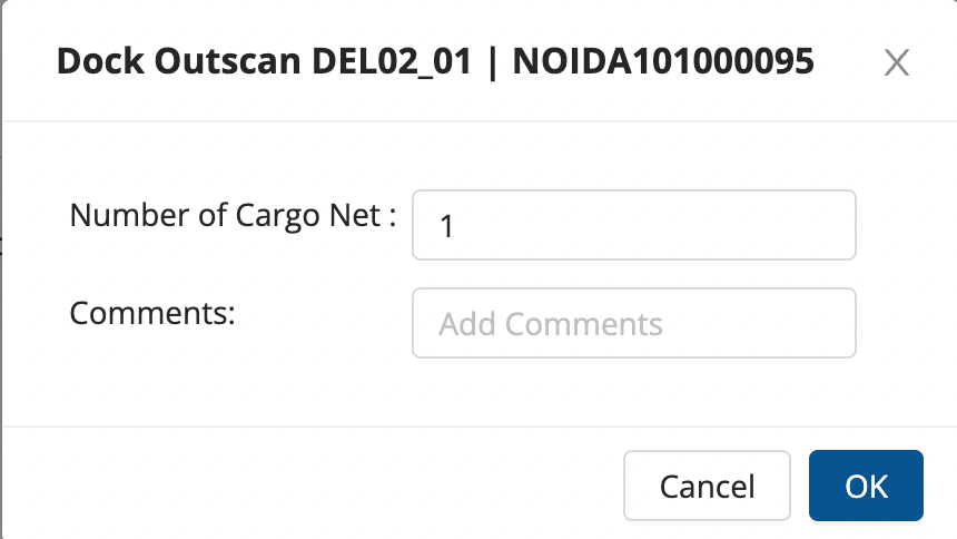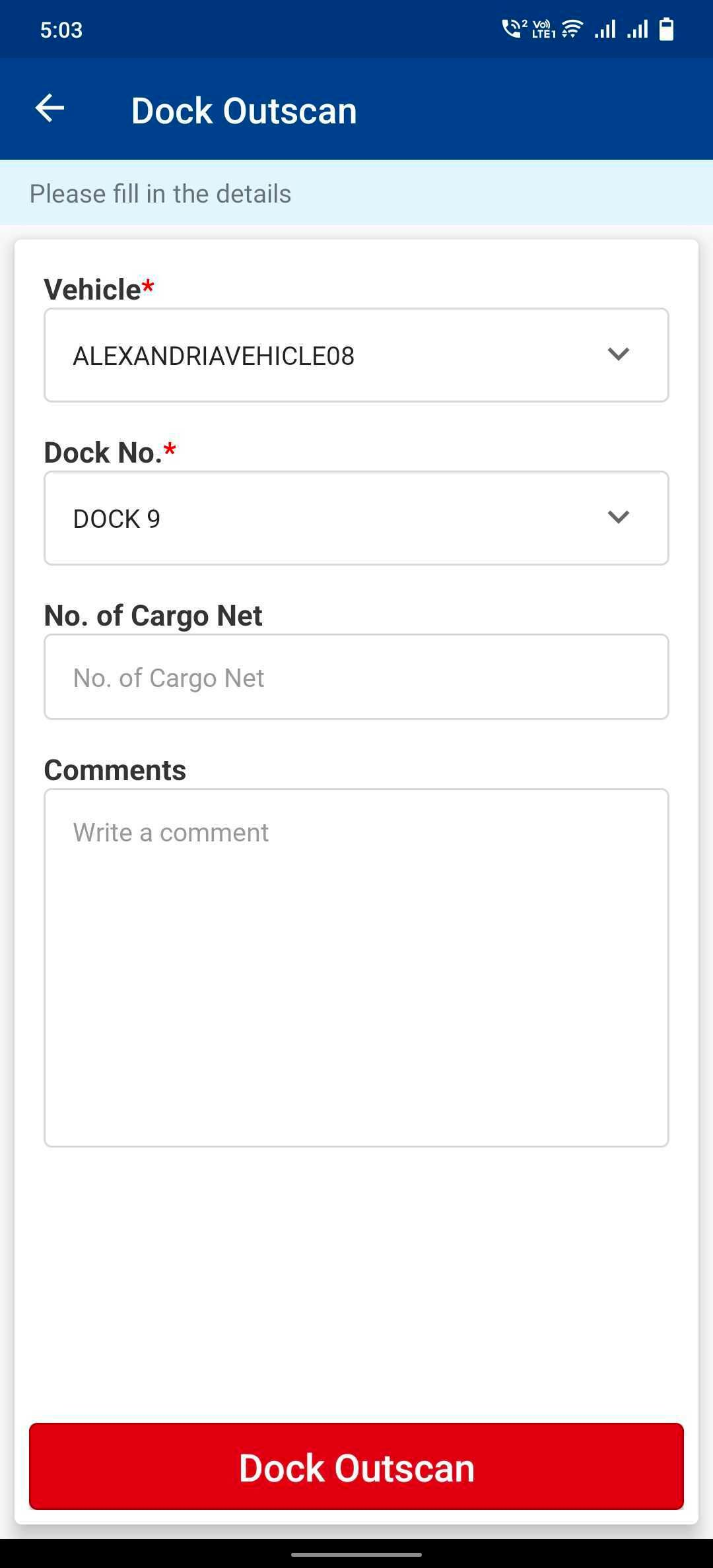 - Enter the required Vehicle, Dock No., No. of Cargo Net and any additional comments, if required.