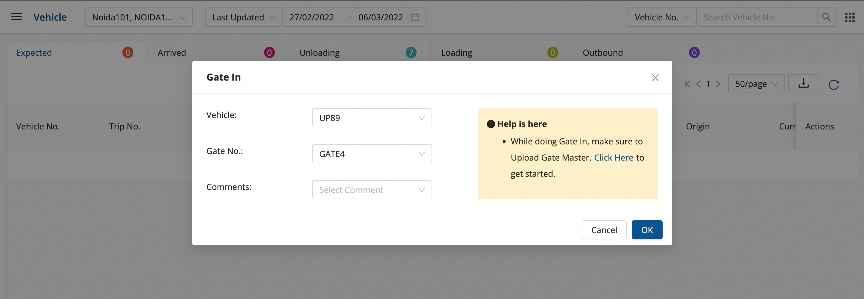 - Enter Vehicle Number, Gate Number and Comments(optional).
