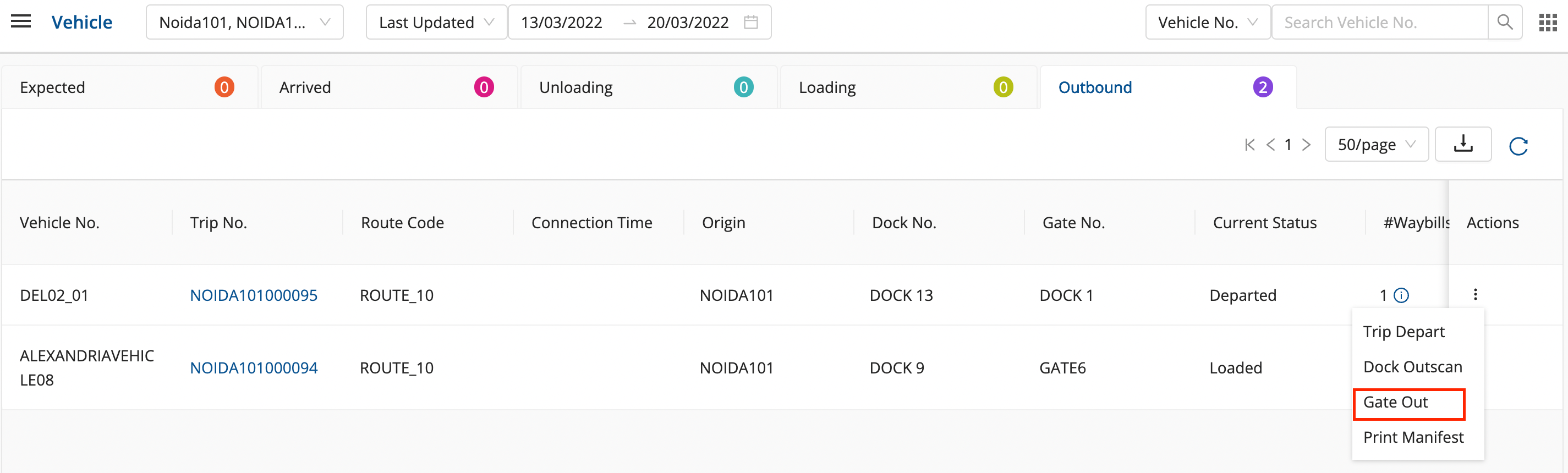In the Outbound section, for the required vehicle, click on the three vertical dots in the action column.