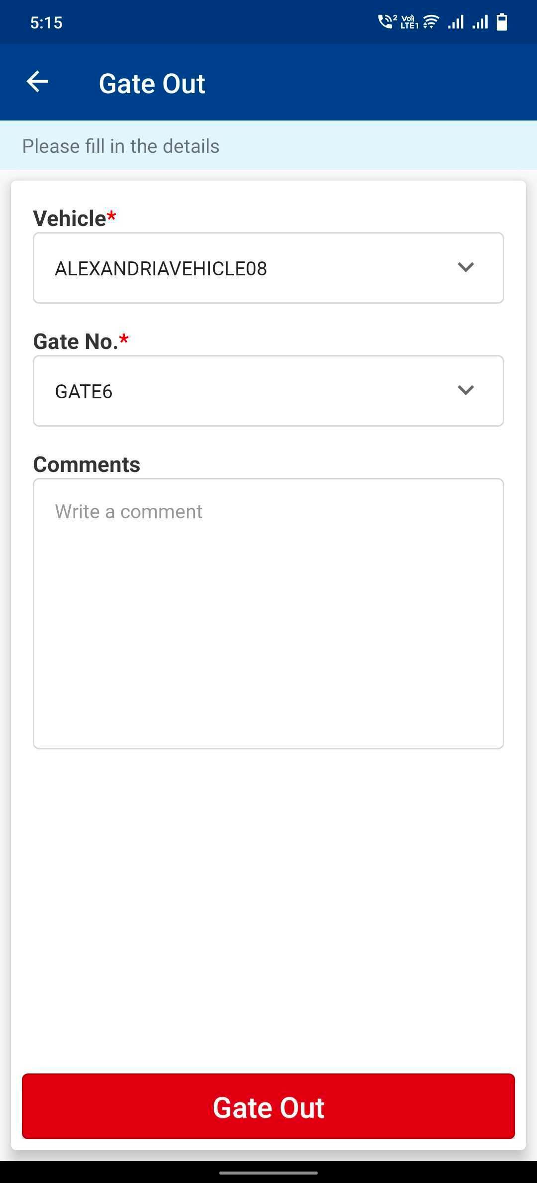 - Enter the required Vehicle, Gate No. and any additional comments, if required.
