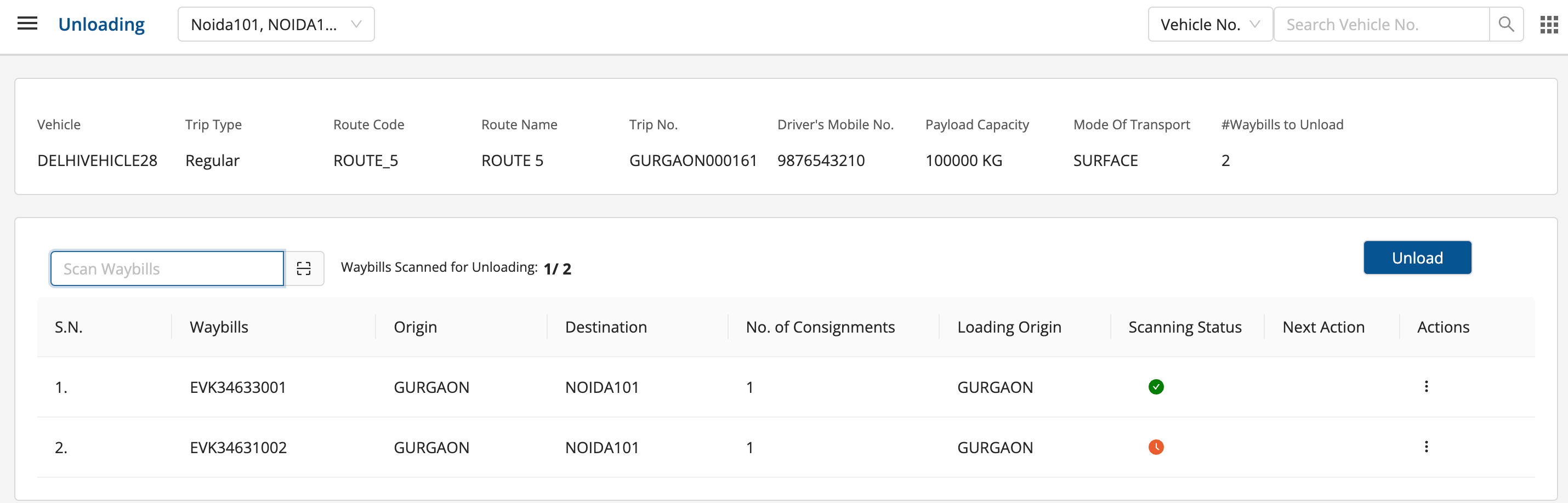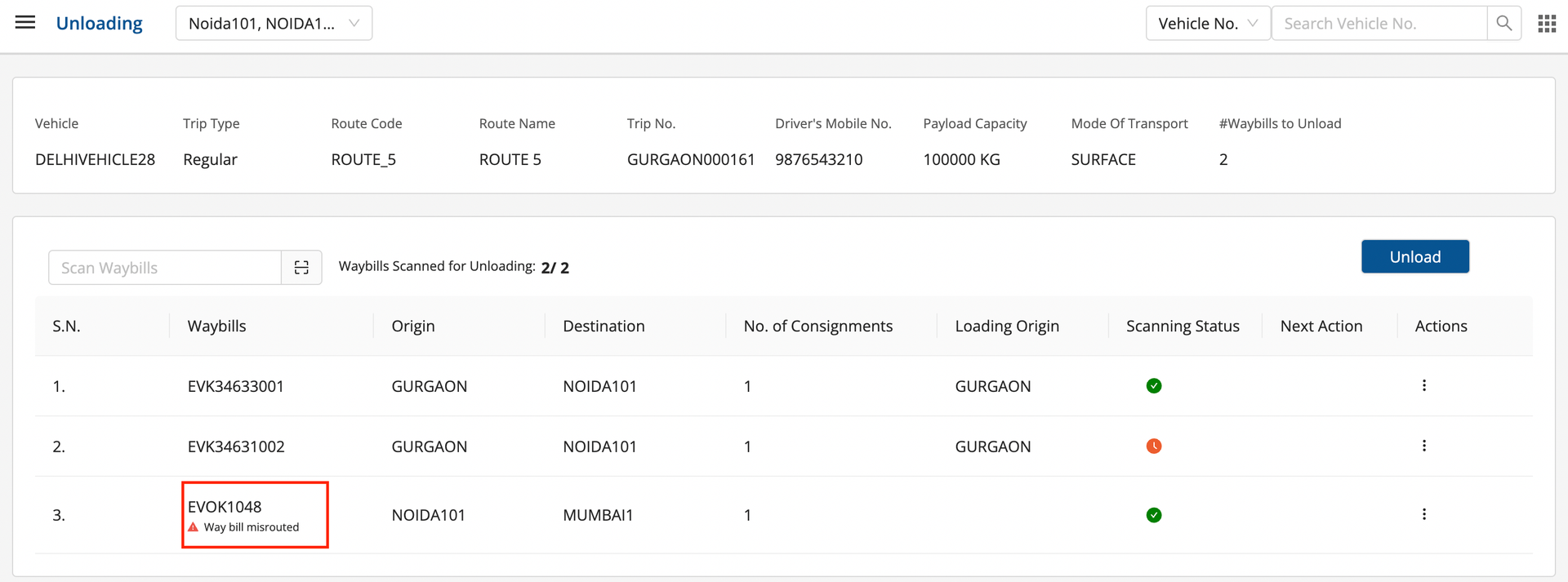 - Click on Unload to unload the consignments successfully.