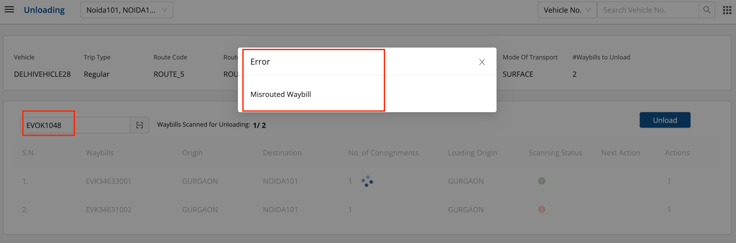 - Now, when we will scan the misrouted waybill, an error msg gets popped up “Misrouted Waybill”.