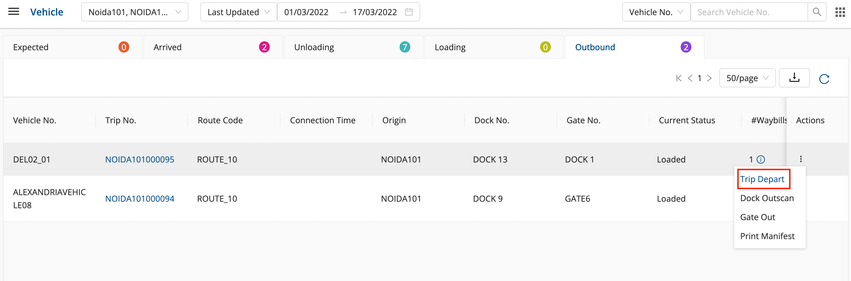 - In the Outbound section, for the required vehicle, click on the three vertical dots in the action column.