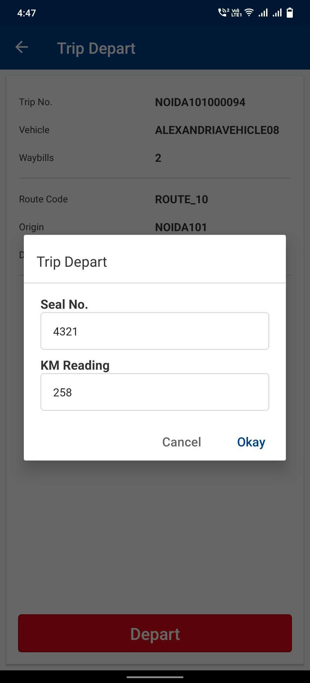 - Enter Seal no. and km reading and click on Okay.
