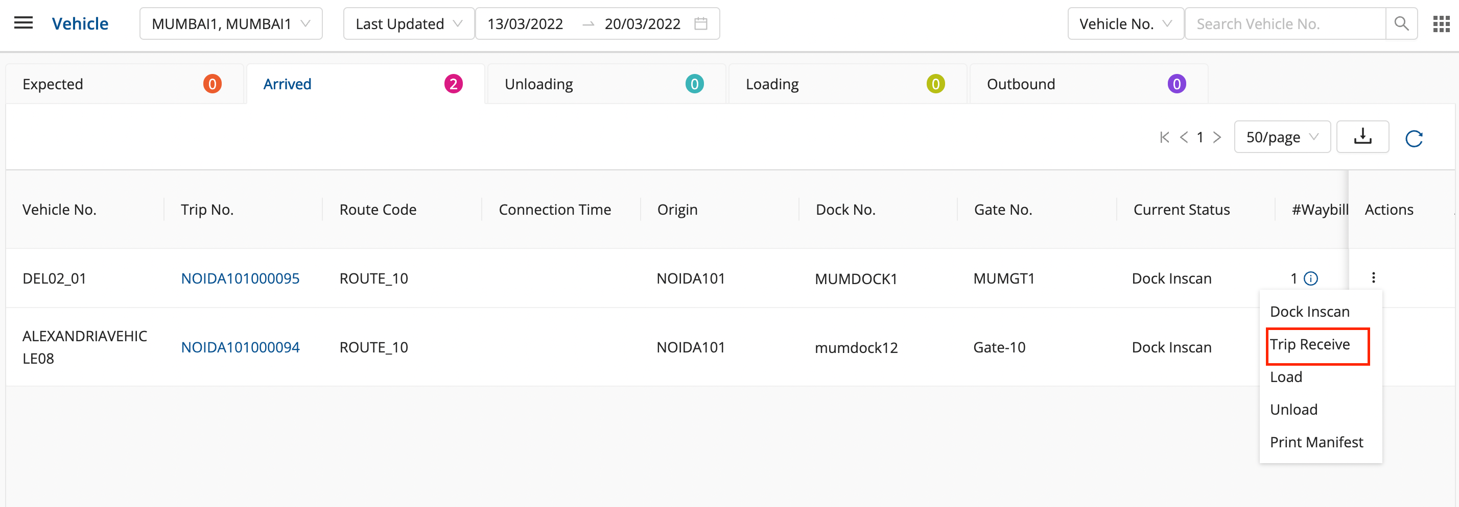 - In the Arrived section, for the required vehicle, click on the three vertical dots in the action column.